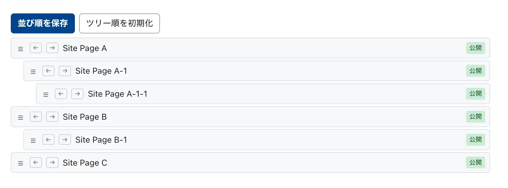 - 記事一覧・ウェブページ一覧・コンテンツデータ一覧から「TreeOrder 表示」で管理画面を表示